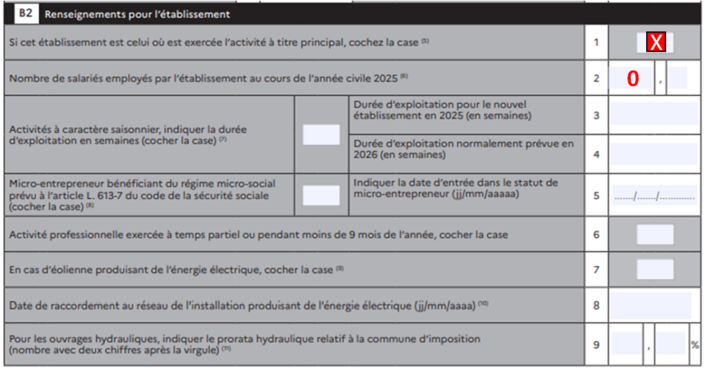- Cadre B2 : Ne pas cocher case 1 (pas établissement principal)