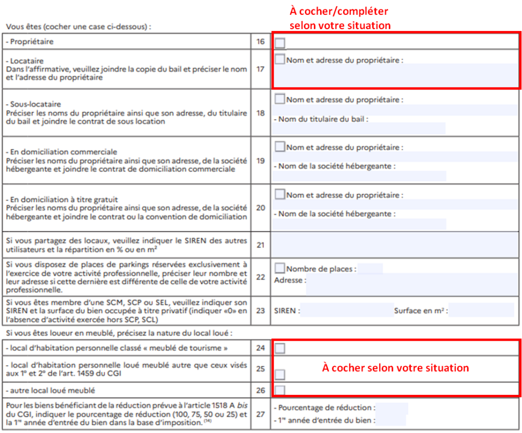 - Case 17 : Locataire → cocher + indiquer nom et adresse du propriétaire