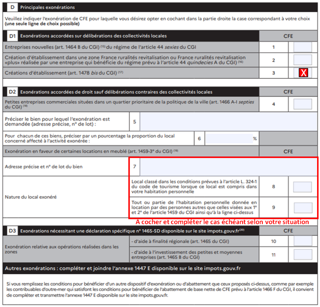 → Cocher la case 3 (colonne CFE) → exonération totale la première année